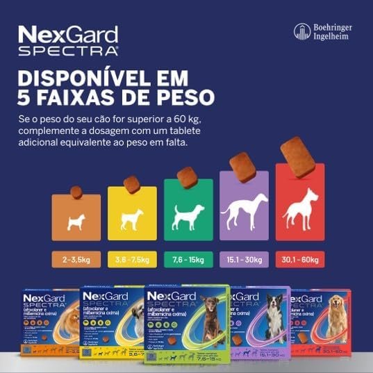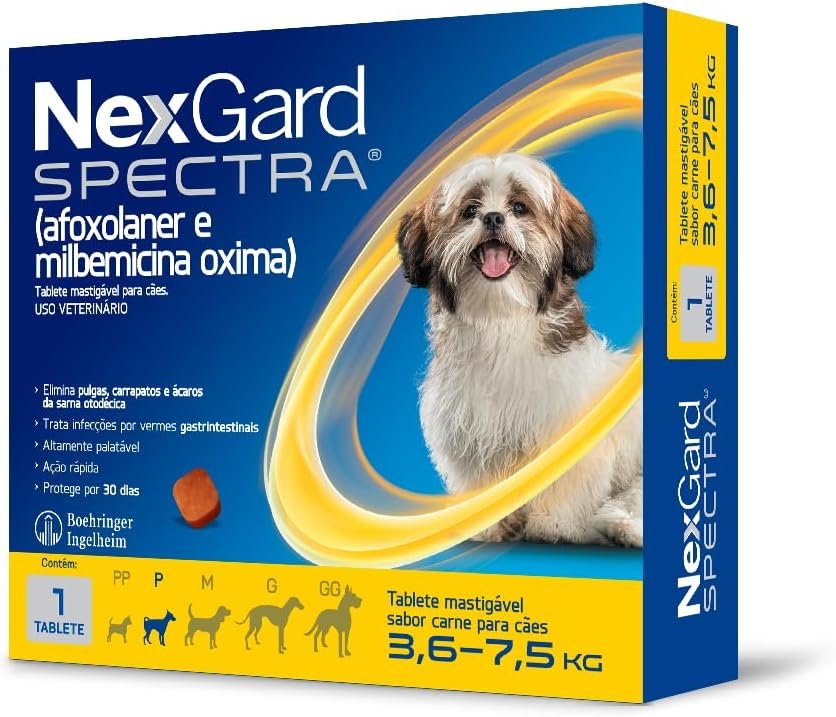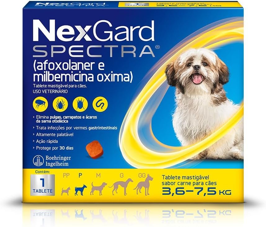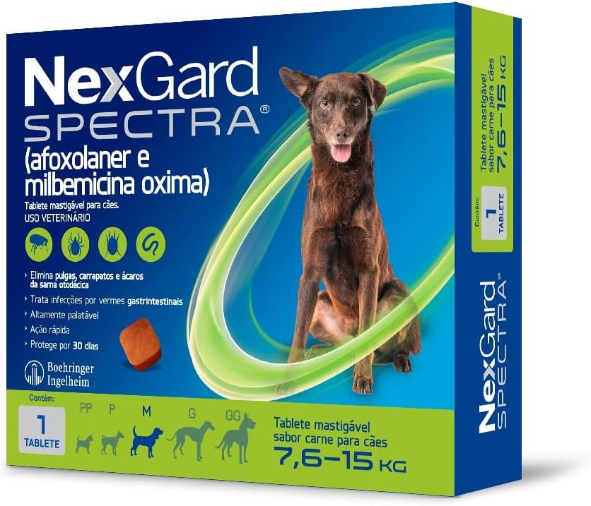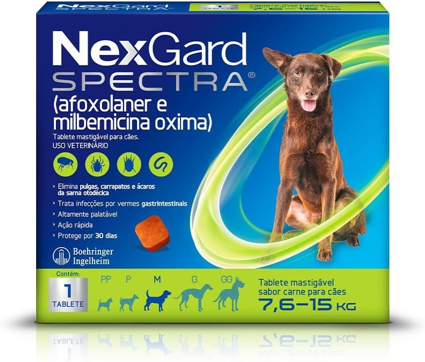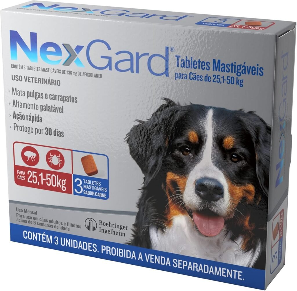 O NexGard é um medicamento veterinário antipulgas e carrapatos fabricado pela Boehringer Ingelheim, disponível em duas apresentações para cães de médio a grande porte: versão para 10,1 a 25kg e versão para 10,1 a 50kg. Cada embalagem contém 3 tabletes mastigáveis que proporcionam proteção mensal contra ectoparasitas.