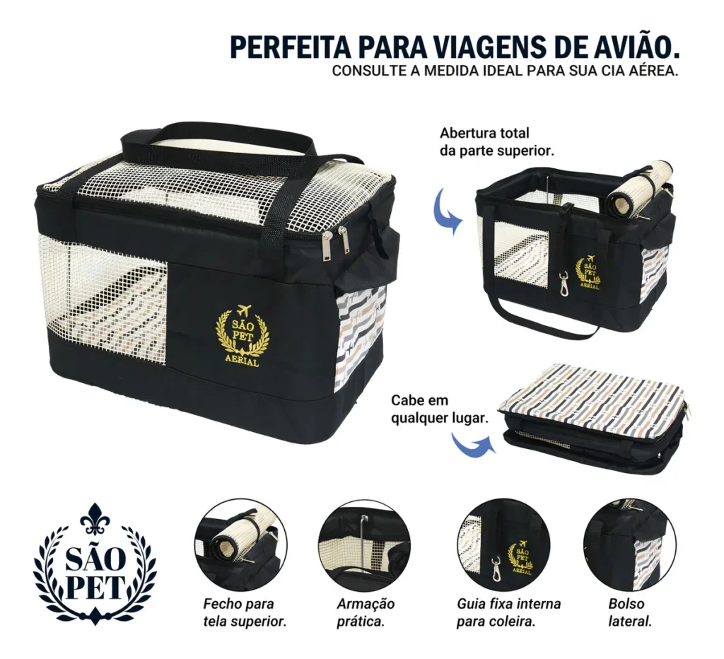 Essa bolsa de transporte para pets foi projetada para quem pretende viajar com seu cão ou gato na cabine do avião, especialmente em voos da LATAM, atendendo aos requisitos de medidas das principais companhias aéreas brasileiras.